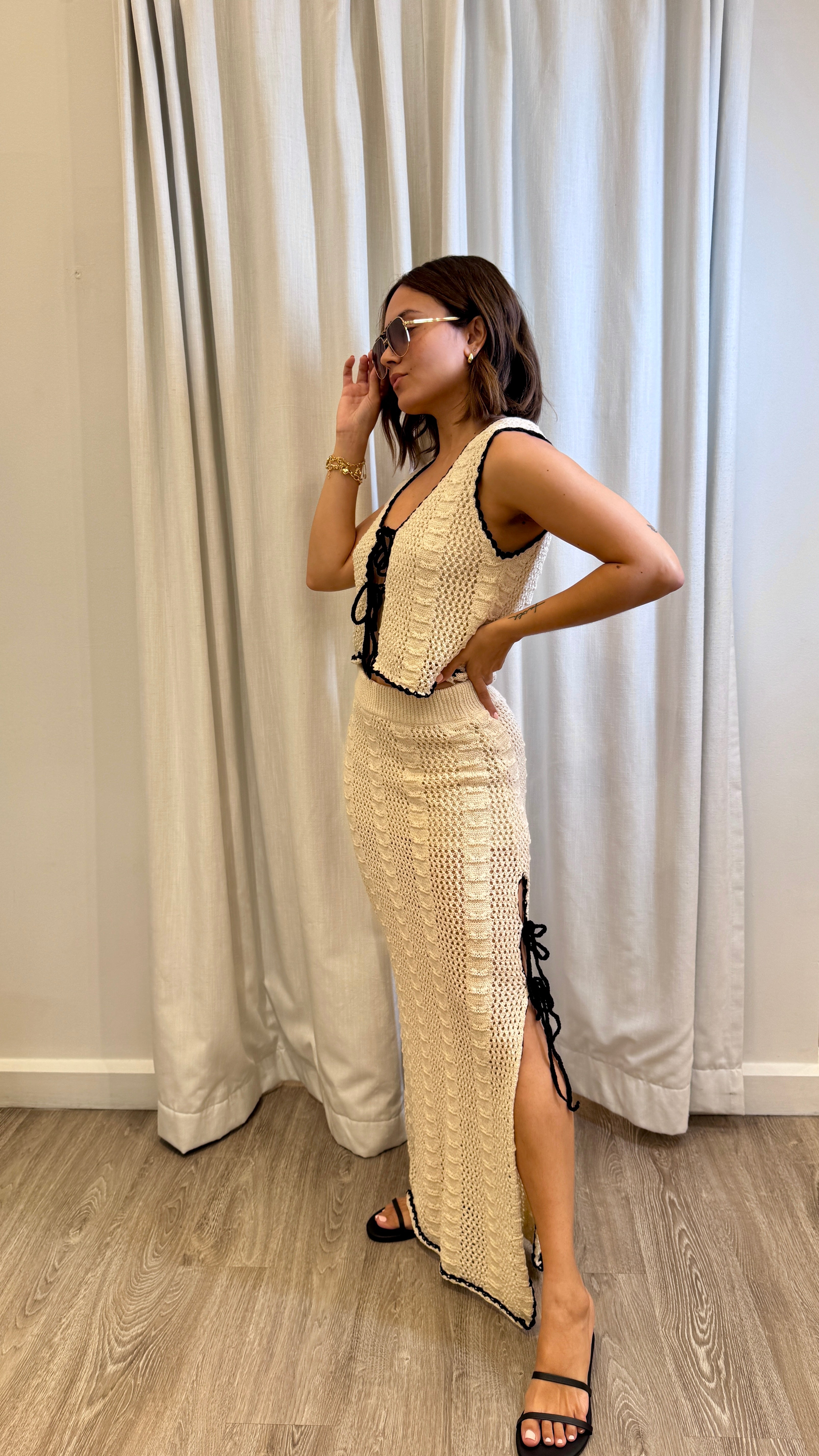 This crochet maxi skirt features a stylish side slit that adds a touch of allure and ease to your movement. Crafted with a delicate crochet pattern, it offers a breathable, lightweight feel perfect for warm days or evenings out. The slit enhances comfort while maintaining an elegant silhouette, making it a versatile piece for both casual and dressier occasions. Elevate your wardrobe with this flattering skirt that effortlessly blends comfort and sophistication.
