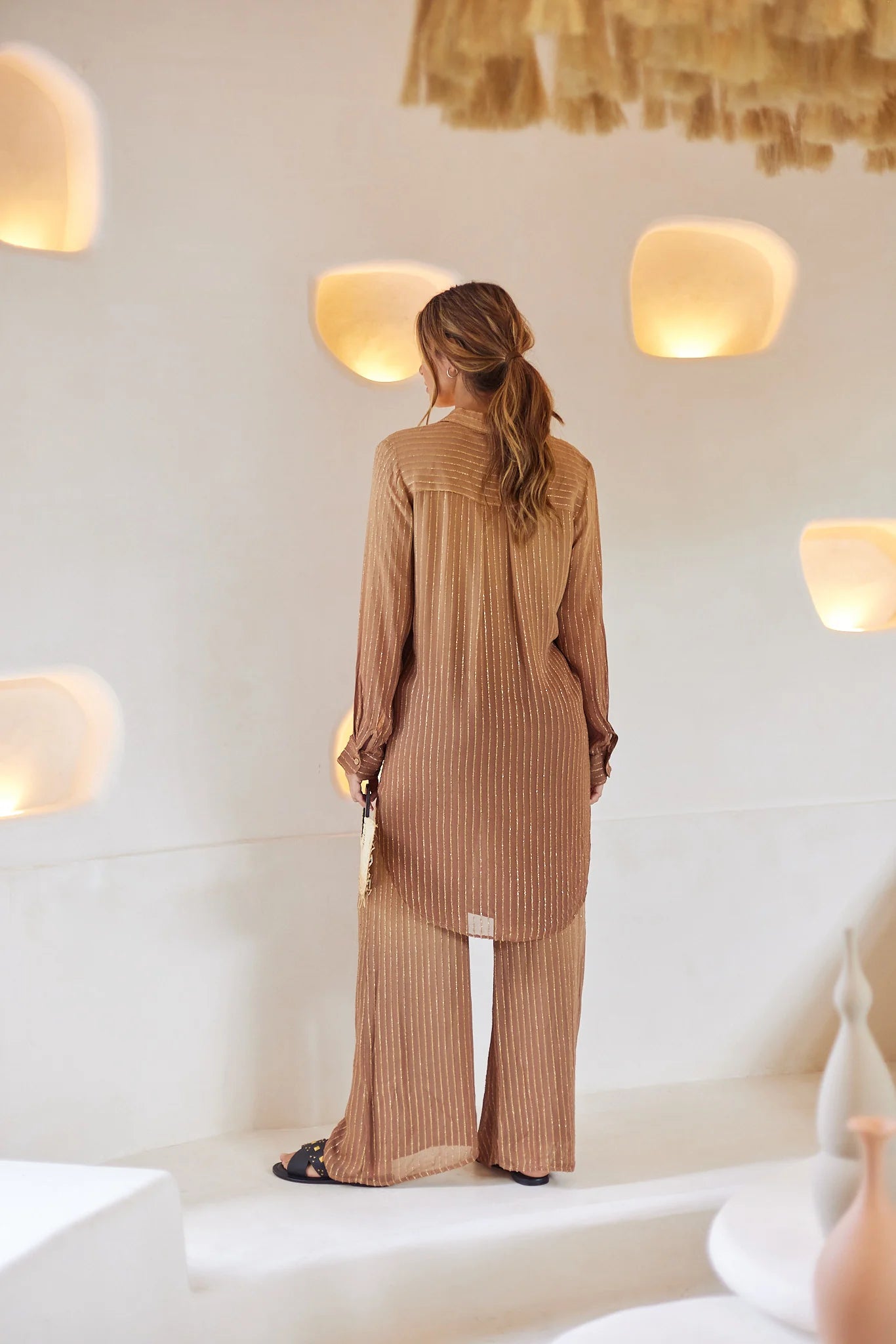 The Mystic Sand Shirt glows with subtle golden tones that cascade in a soft degradé from waist to hem. Lightweight and airy in 100% viscose, it sways beautifully with every step. Whether styled casually with a cropped top or dressed up for a summer night out, it’s a timeless piece that channels effortless radiance.