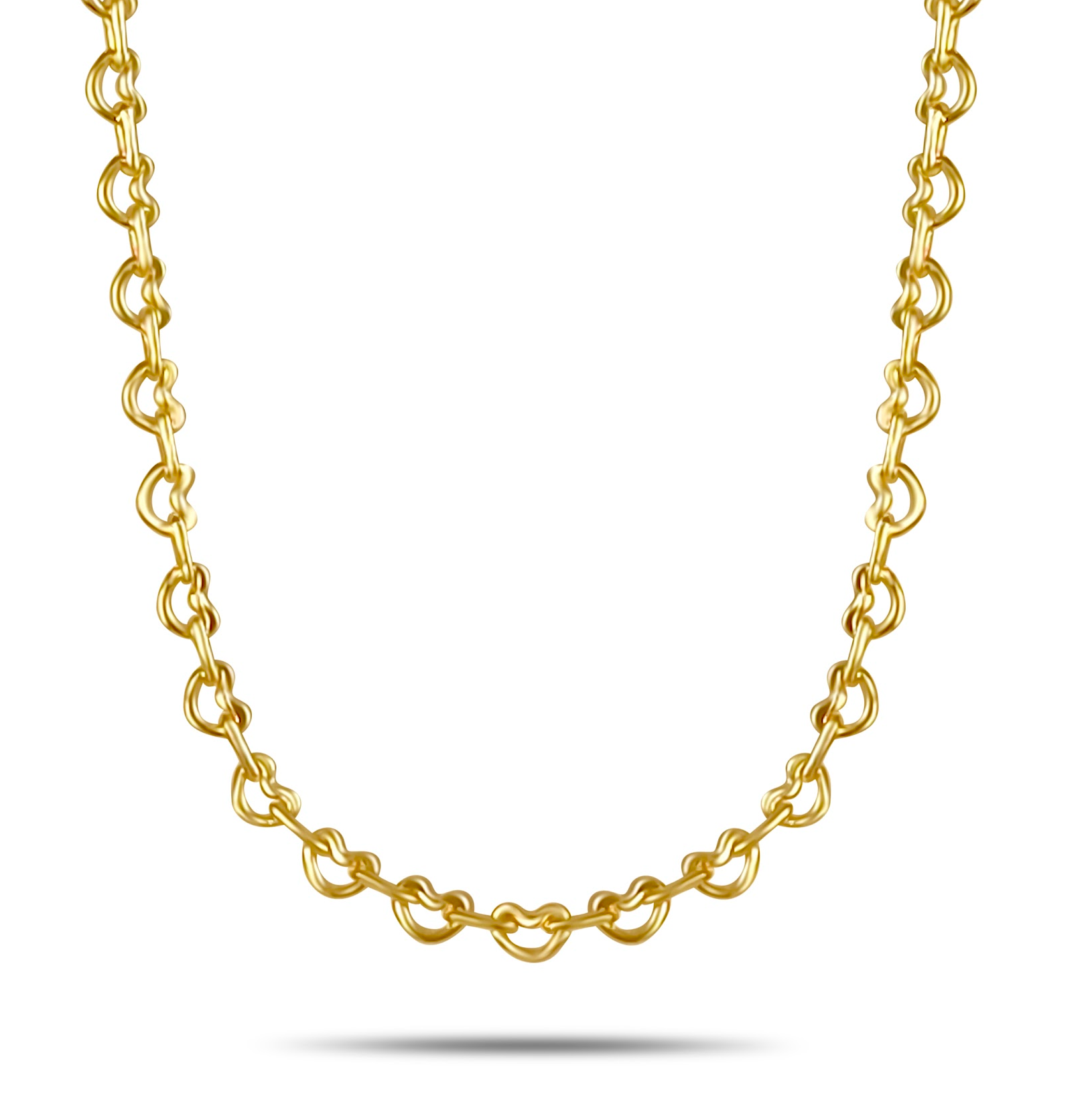 Fall in love with this heart-shaped gold link chain necklace, a romantic yet timeless addition to your jewelry collection. Crafted from high-quality 18-karat gold-filled material, this necklace features delicately interlocking heart-shaped links that add a unique and elegant touch. Its polished finish catches the light beautifully, making it perfect for both everyday wear and special occasions.