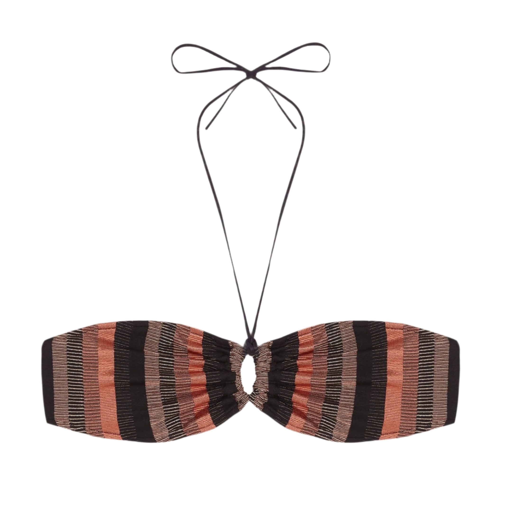 Bandeau top with central oval ring with removable black spaghetti tied neck strap. It fastens with a back closure.