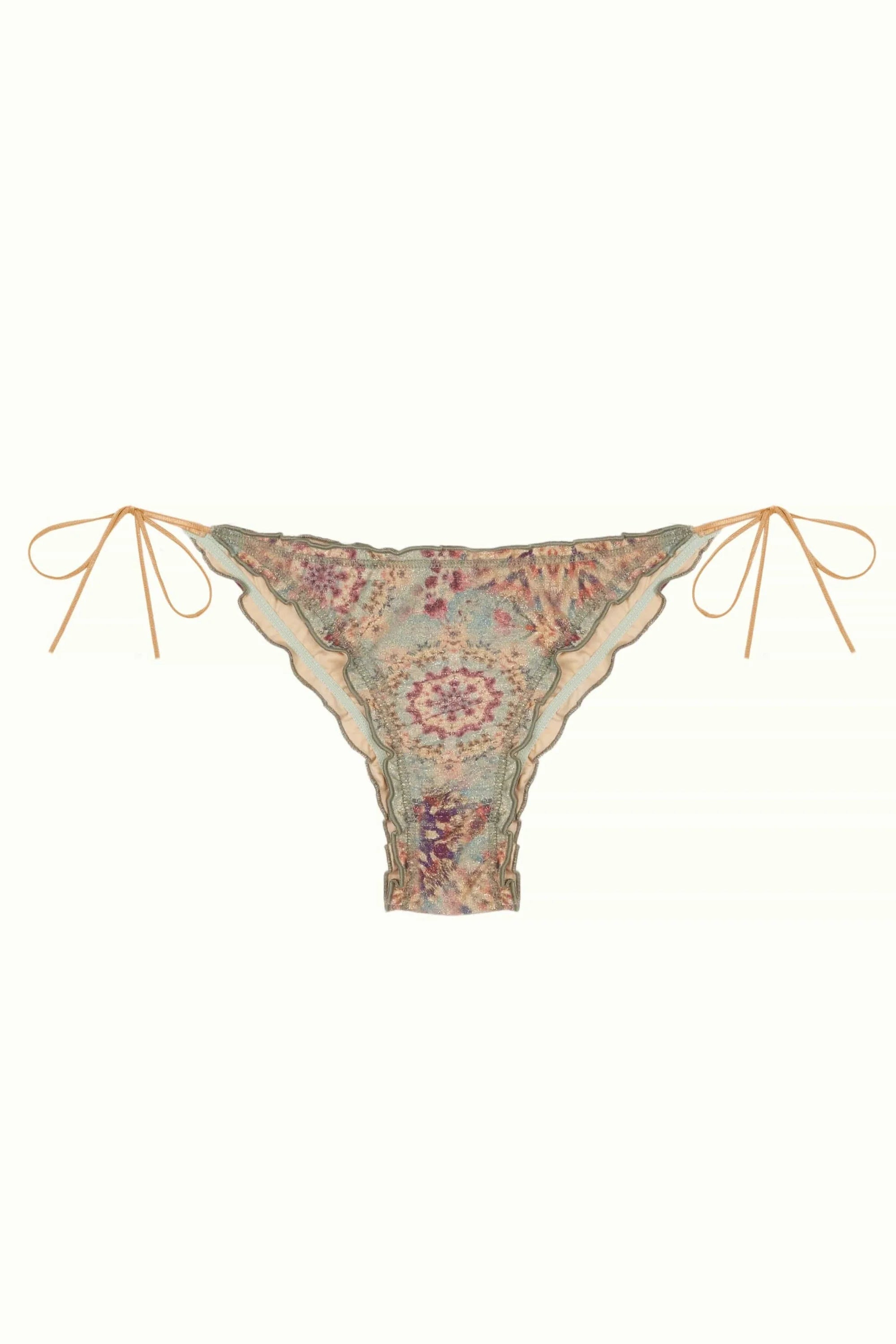 Bikini bottom with our iconic star pattern, featuring gathered details at the edges and a gathered center at the back. Fully adjustable side ties. Available in two fits: