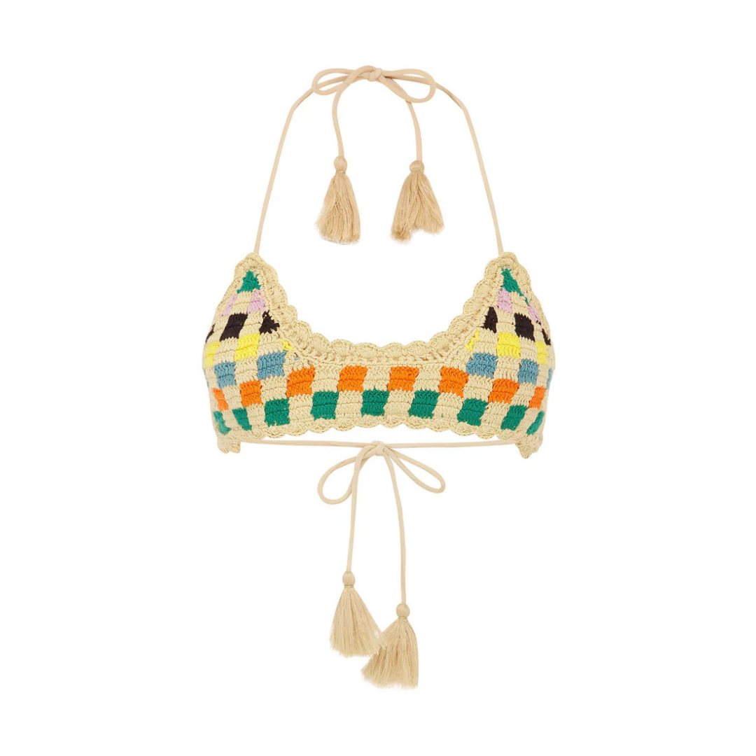 Introducing, The Crop Top in Sablo exudes charm with its soft scallop edging and colorful squares intricately woven into the design. Adding a playful touch, the ties are adorned with charming tassels.