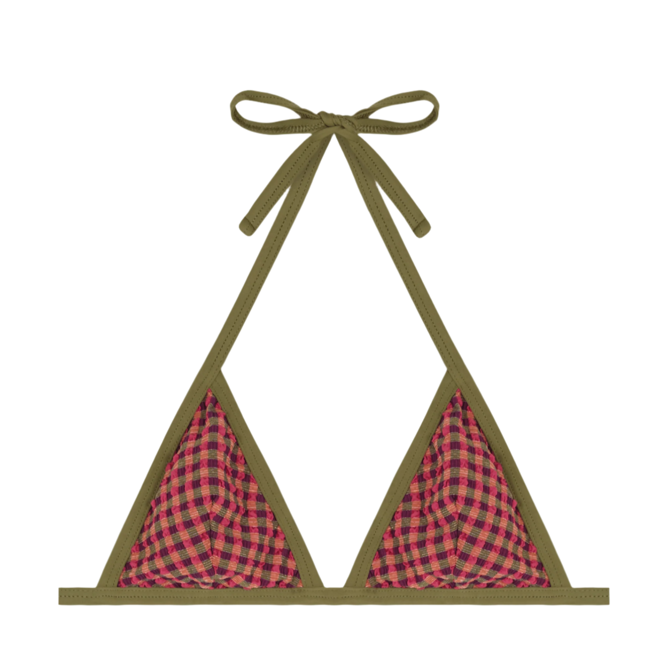 Triangle-shaped bikini top printed with vichy squares with seersucker texture, in pink and purple tones. Sparkly lurex details add a subtle touch of shine.